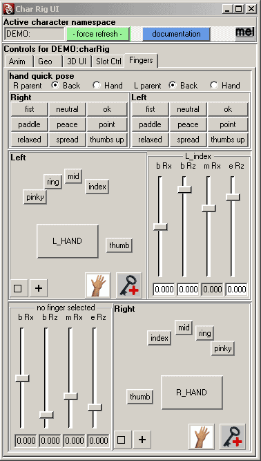 Here's a sample user interface I wrote a while ago to make life easier for animators on my team. Its a complex looking UI, but it's really just a precisely defined series of simple MEL commands. At the top you can see I've called a window and labeled it "Char Rig UI". Under that is a text field that displays the current reference namespace. In the main section are five tabs, each labeled "Anim, Geo, 3D UI, Slot Ctrl, and Fingers". The fingers tab is the current selection. In this tab we have radio buttons at the top, followed by two frames of hand poses. The frames each contain nine buttons labeled "fist, neutral, ok, paddle, peace, point, relaxed, spread, and thumbs up". In the lower right corner of this frame are two image buttons that make use of some images that already exist in Maya. They select all the fingers at once and set keyframes on the current selection. The next frame is labeled "Left" and contains finger selection buttons that have been carefully placed into a form to look like a hand. The frame after that one is currently labeled "L_index" because the controller for the left index finger was the most recently selected. The frame's label is set to dynamically change to match the current selection. The sliders in this frame also dynamically update to control the rotations of the bones in the most recently selected finger. Under each slider is a field that displays the current rotation value of the bone and axis that the slider above it controls. This is repeated for the right hand at the bottom. |