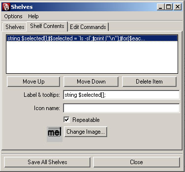 Here you can modify your frequently used commands, label your shelf buttons, and even use custom 32 X 32 .bmp files as images for your buttons.