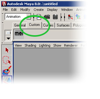 Now click on the "Custom" shelf to prevent cluttering up Maya's native shelves with new scripts. Then simply highlight the script you want in the Script Editor and middle-mouse drag it onto the open gray space in the shelf. You may notice a white "plus" next to your cursor as you hover over the correct space. Now let go. You should see a generic "mel" button on your shelf. You can edit the contents at any time by using the options in the drop down menu available to the left of the shelves. This is where you'll find the shelf editor.